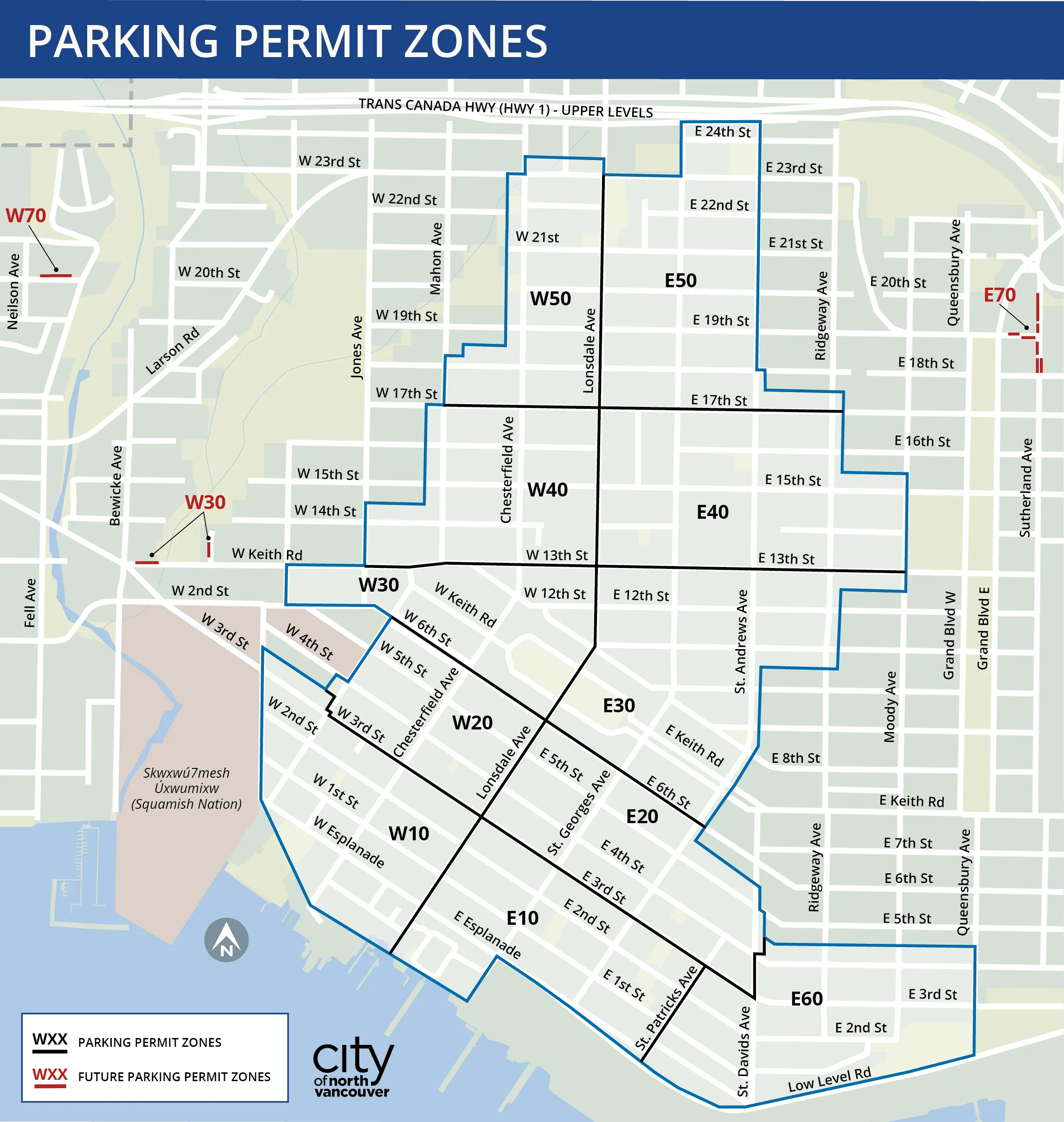 Residents of Zone E30 (Central Lonsdale 6th Street to 13th Street) may now apply for permits through the City. Each household may obtain up to two permits, the first costs $8.33 per month, and the second $12.50 per month. In addition, visitor and contractor passes remain available.
